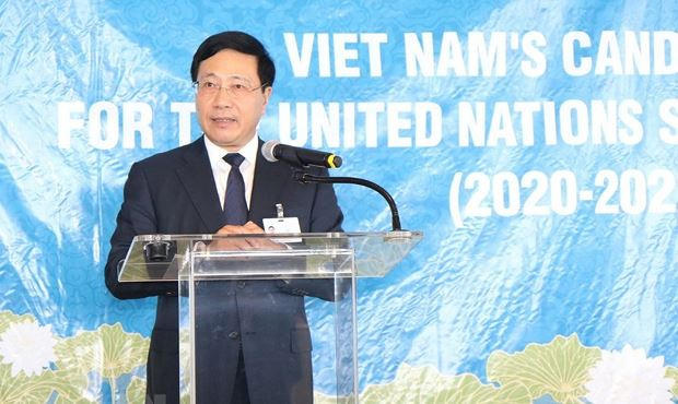 Theo Bộ Ngoại giao, phát biểu tại buổi vận động với sự tham dự của 100 lãnh đạo cấp cao, Bộ trưởng Ngoại giao và Đại sứ, đại diện các nước thành viên LHQ để vận động ủng hộ Việt Nam ứng cử làm uỷ viên không thường trực HĐBA LHQ nhiệm kỳ 2020-2021, Phó Thủ tướng, Bộ trưởng Ngoại giao Phạm Bình Minh nhấn mạnh việc ứng cử vào HĐBA LHQ thể hiện đường lối đối ngoại hòa bình, độc lập, tự chủ, cũng như mong muốn của Việt Nam được đóng góp vào nỗ lực chung của cộng đồng quốc tế vì hoà bình, an ninh và phát triển bền vững.