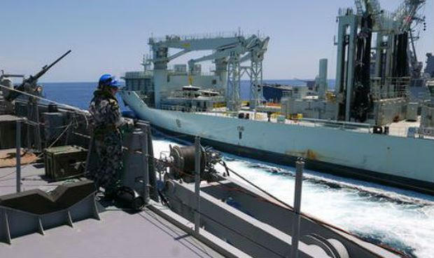| Thủy thủ trên tàu khu trục Australia quan sát tàu khu trục Canada tới tham gia tập trận. |