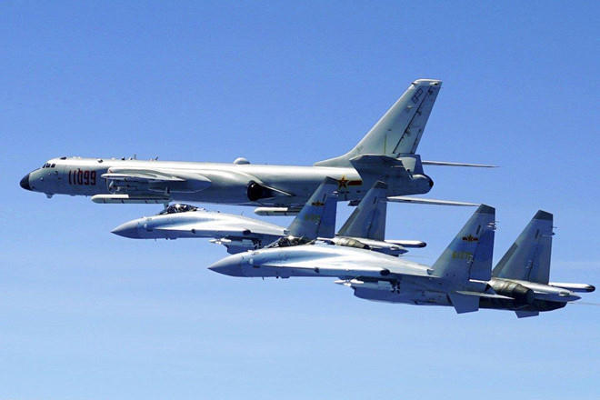 Tiêm kích Su-35 hộ tống máy bay ném bom H-6K trong một nhiệm vụ. Ảnh: AP.