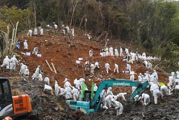 Lực lượng cứu hộ tìm kiếm thi thể các nạn nhân và khắc phục hậu quả vụ tai nạn máy bay của China Eastern Airlines tại thành phố Ngô Châu, tỉnh Quảng Tây (Trung Quốc) ngày 25/3/2022. (Ảnh: THX/TTXVN)