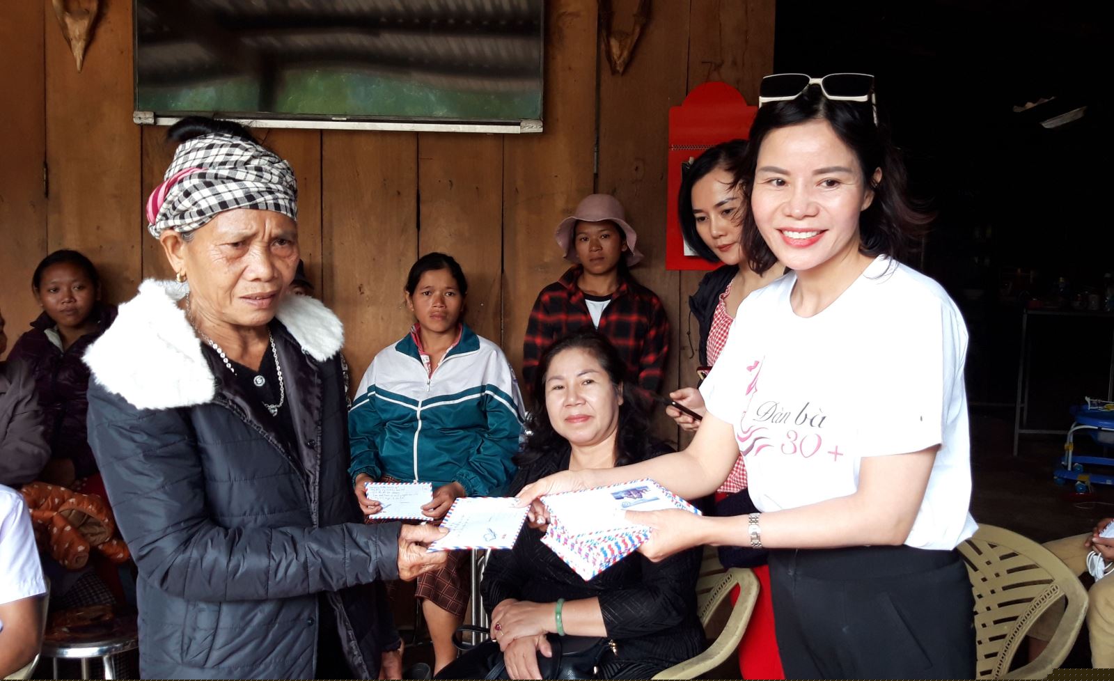 Bà Nguyễn Thị Mỹ Hạnh - Chủ tịch Group "Đàn bà 30+" cùng các thành viên trong đoàn trao tặng quà cho các hộ dân bị thiệt hại nặng nề do lũ. Ảnh: Văn Tùng