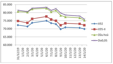 Từ 15h, ngày 15/1/2020, giá xăng dầu được điều chỉnh: Xăng E5RON92 giảm 36 đồng/lít; Xăng RON95-III giảm 77 đồng/lít; Dầu diesel 0.05S giảm 43 đồng/lít; Dầu hỏa giảm 50 đồng/lít; Dầu mazut 180CST 3.5S tăng 789 đồng/kg.
