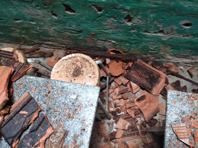 Mái ngói đổ sập xuống, may mắn sự việc xảy ra vào ngày nghỉ nên không có ai bị thương.