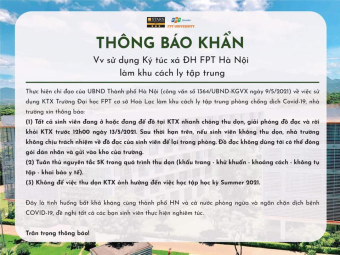 Thông tin trên ViêtNamNet, Ngày 10/5, sinh viên Trường ĐH FPT nhận được thông báo ký túc xá của trường sẽ trở thành khu cách ly tập trung.