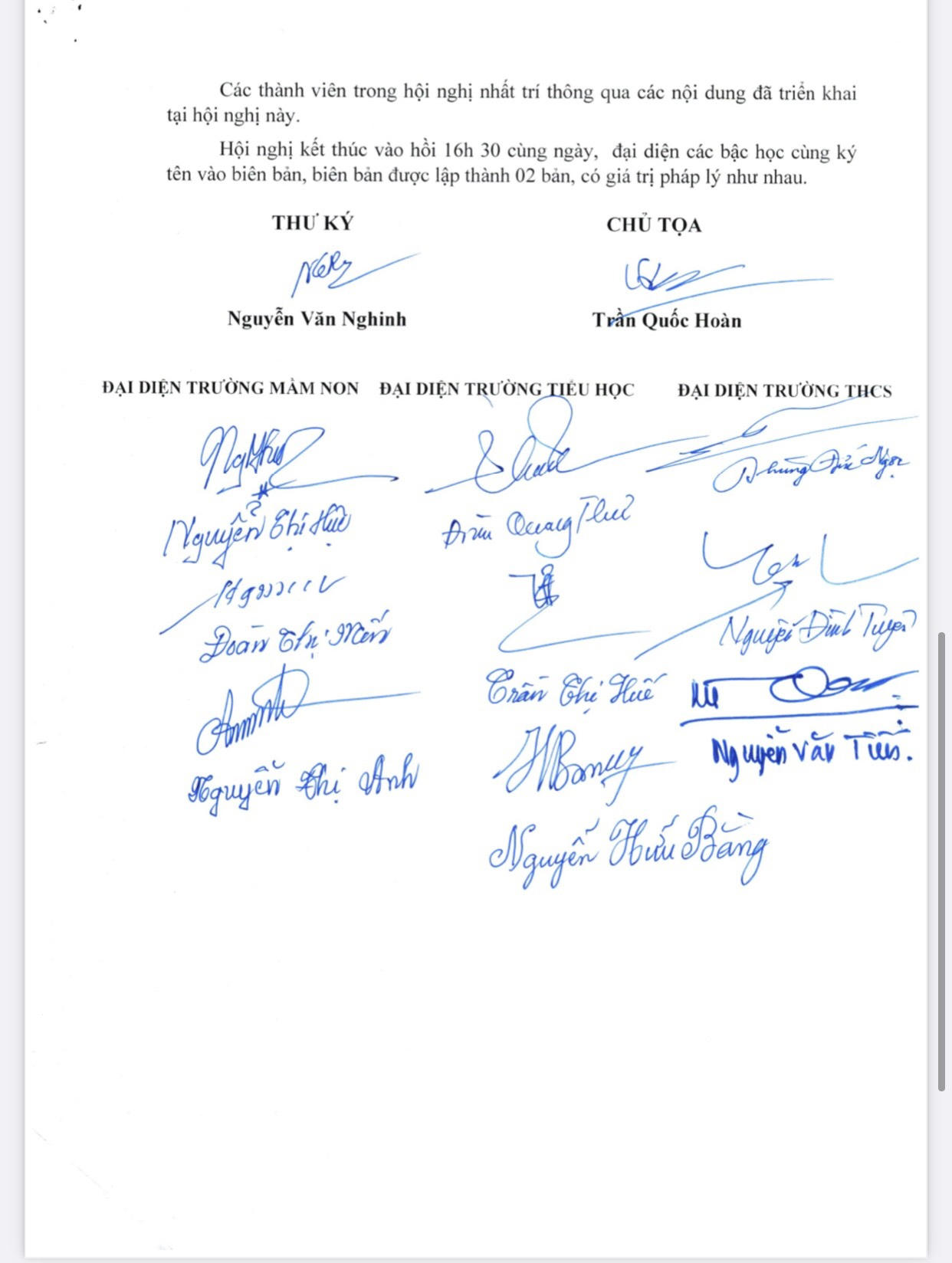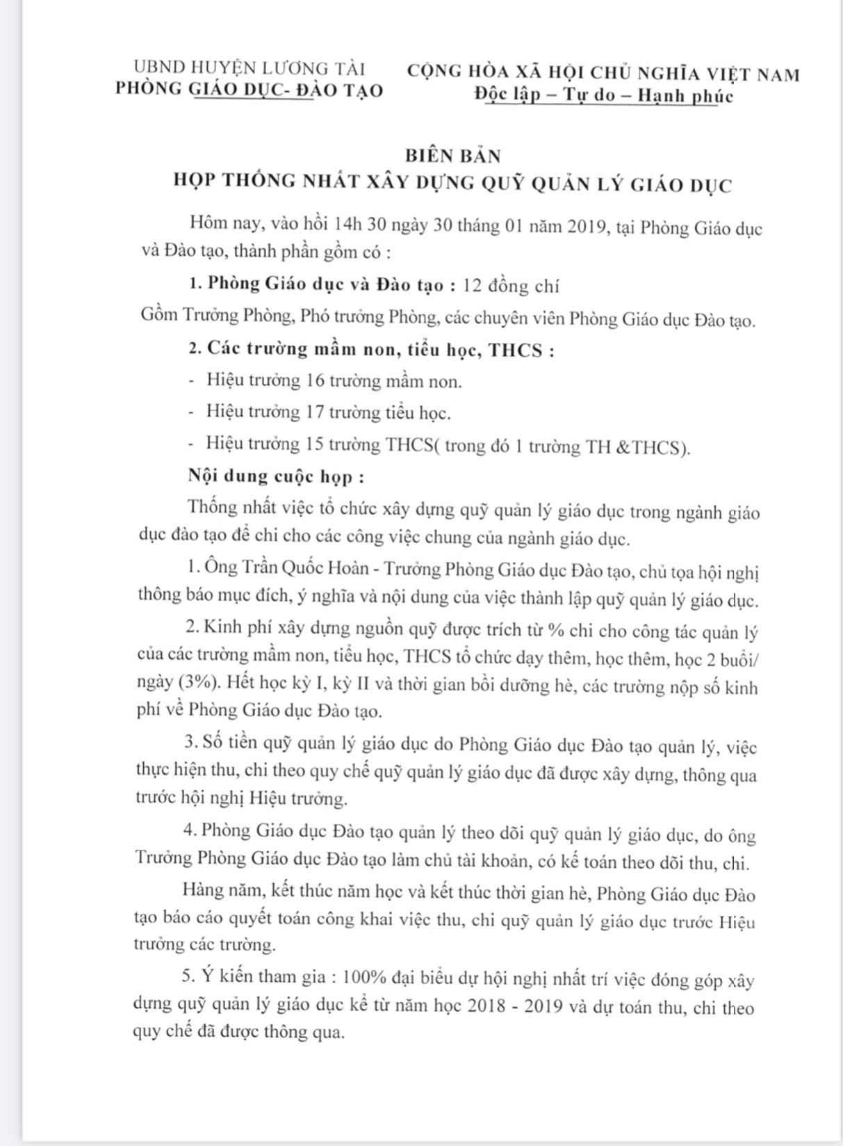 Biên bản họp thống nhất xây dựng quỹ quản lý giáo dục do ông Trần Quốc Hoàn làm chủ tài khoản khoản thu 3% trái quy định có chữ ký đại diện của 3 thầy cô đang là Hiệu trưởng đại diện cho cấp mầm non, tiểu học và trung học cơ sở ký.