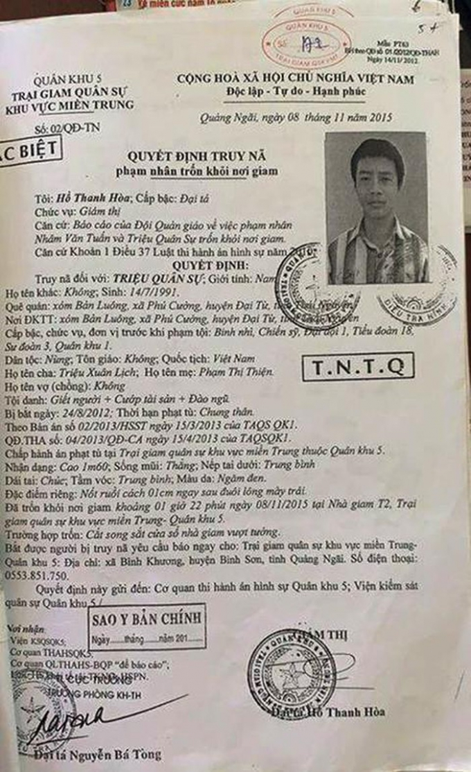 Đặc điểm nhận dạng của phạm nhân Triệu Quân Sự: cao 1,6m; sống mũi thẳng; màu da ngăm đen; có nốt ruồi cách 1cm ngay sau đuôi lông mày trái…