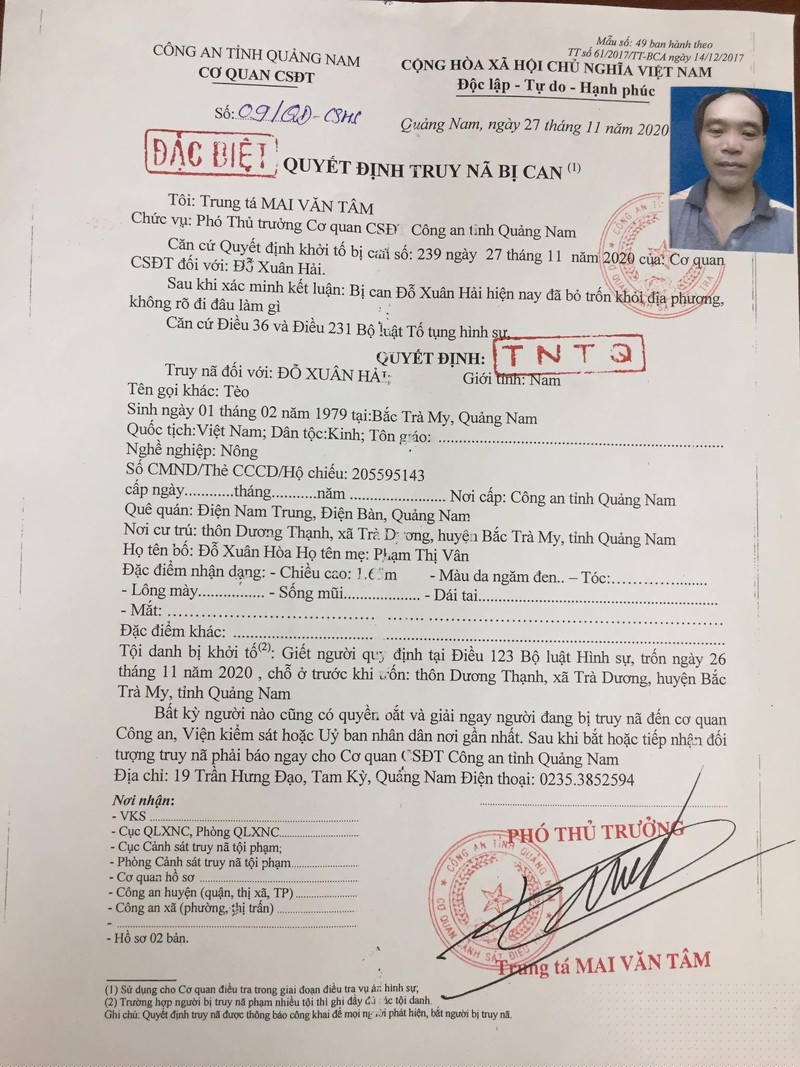 Công an tỉnh Quảng Nam đã có quyết định truy nã bị can Đỗ Xuân Hải (41 tuổi, trú thôn Dương Thạnh, xã Trà Dương, huyện Bắc Trà My, tỉnh Quảng Nam) về tội “ Giết người”.