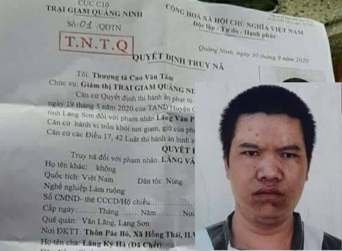 Phạm nhân Lăng Văn Phi vừa bị Trại giam Quảng Ninh (Cục C10, Bộ Công an) vừa ra quyết định truy nã toàn quốc về hành vi trốn khỏi trại giam.