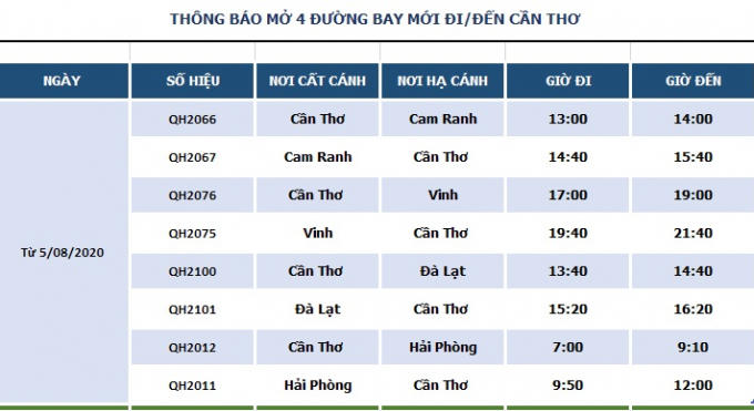 Từ ngày 5/8/2020, Bamboo Airways khai trương 4 đường bay mới kết nối Cần Thơtới 4 thành phố Hải Phòng,Cam Ranh, Đà Lạt và Vinh với tần suất 1 chuyến khứ hồi/ngày. Thời gian cụ thể như sau:
