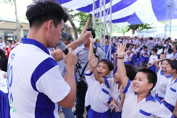 Hai nghệ sĩ mang tiếng cười sảng khoái cho các em học sinh và người dân Chợ Mới, An Giang qua màn thi uống sữa vui nhộn.