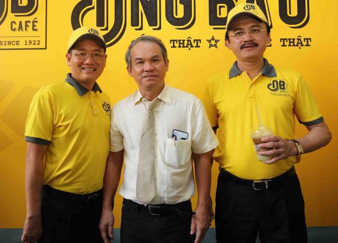 Ba "ông bầu" trong sự kiện công bố chuỗi cà phê cán mốc 100 điểm bán trên toàn quốc. Từ trái sang phải: ông Trần Thanh Hải, ông Đoàn Nguyên Đức và ông Võ Quốc Thắng.