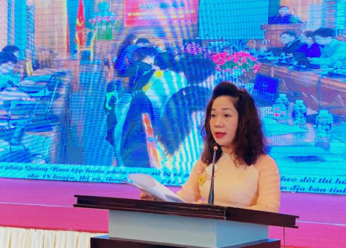 Phó Giám đốc Sở Tư pháp tỉnh Quảng Bình Võ Thị Diệu Hương trình bày báo cáo tổng kết công tác thi đua, khen thưởng năm 2020