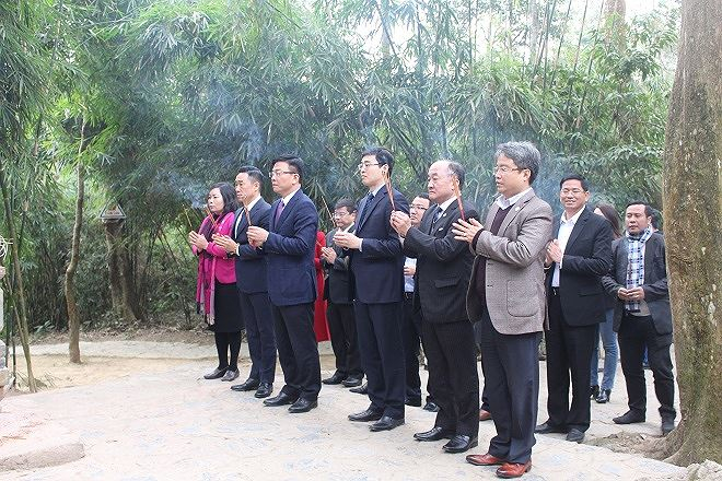 Bộ trưởng Lê Thành Long (hàng đầu, thứ 3 từ trái sang) dẫn đầu đoàn công tác của Bộ Tư pháp dâng hương tại Khu Di tích lịch sử Bộ Tư pháp, xã Minh Thanh, Sơn Dương, Tuyên Quang tháng 2/2018.
