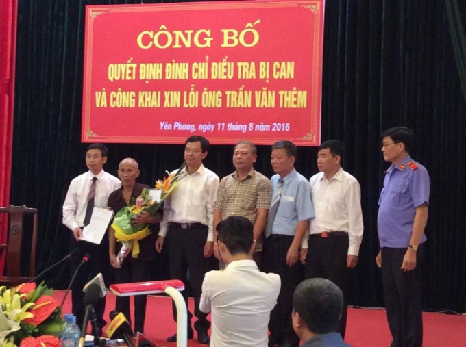 Sáng nay 11/8, tại hội trường trung tâm huyện Yên Phong, tỉnh Bắc Ninh, Liên ngành các cơ quan tư pháp trung ương gồm đại diện TAND Cấp cao tại Hà Nội, VKSND Cấp cao tại Hà Nội, Bộ Công an đã tổ chức buổi công bố quyết định đình chỉ điều tra bị can và công khai xin lỗi đối với ông Trần Văn Thêm (80 tuổi, ngụ tại Bắc Ninh), người đã mang thân phận tử tù hơn suốt 40 năm qua.