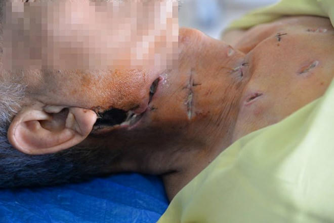 Trước đó, bệnh nhân K.V.V. (66 tuổi, quê Phúc Thọ, Hà Nội) nhập viện trong tình trạng vùng mang tai xuất hiện vết thương hở lan rộng dưới cằm, cổ, sưng tấy đỏ, nhiều vị trí hở lớn, chảy mủ do tự ý đắp lá và dùng thuốc kháng sinh không rõ nguồn gốc.