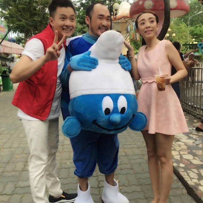 Tiến Luật, Thu Trang và Ngô Kiến Huy cùng tham gia một sự kiện ngoài trời cho thiếu nhi. Thu Trang dí dỏm: "Bộ tam sên".