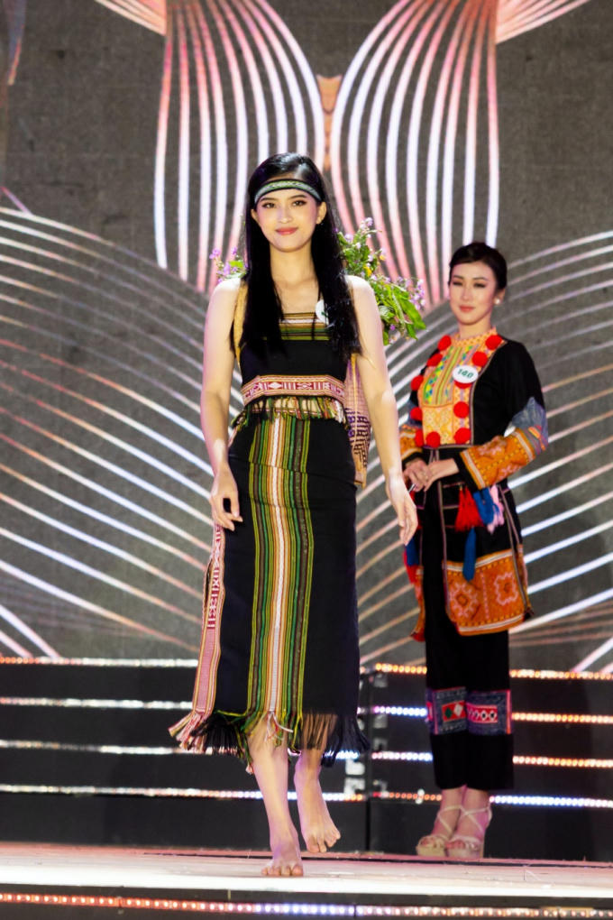 Thí sinh Đặng Thanh Ngân đến từ Đắk Nông xuất hiện tinh tế trong trang phục của người phụ nữ Lô Lô. Cách phối màu mang đặc trưng riêng nhưng vẫn có tính thẩm mĩ, tinh tế và khéo léo.