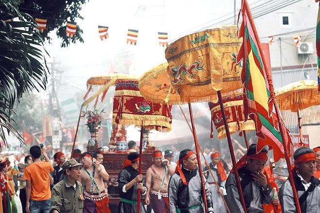 Đám rước với sự tham gia của 4 làng có 4 ngôi chùa: Pháp Vân, Pháp Vũ, Pháp Lôi, Pháp Điện. Ngay từ sáng sớm, kiệu bà Pháp Lôi được rước từ làng Nhạc Miếu sang làng Hồng Cầu. Tất cả phù giá là những chàng trai được tuyển chọn, to béo, mình mặc khố điều. Cứ khoảng 300m, kiệu bà lại chạy một đoạn rồi dừng. Khi chạy trai kiệu sẽ kêu: Huế...Huế...(gọi tên tục của bà), còn người cờ lệnh đọc bài ca:
