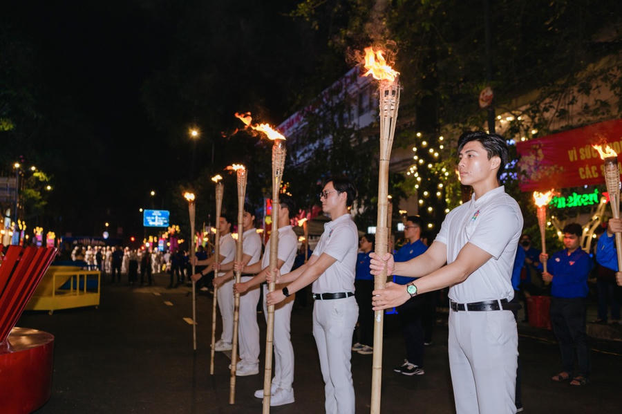 Cùng thắp đuốc khai mạc Lễ hội thanh niên TP.HCM 2024 có Bí thư Trung ương Đoàn Nguyễn Phạm Duy Trang, Phó bí thư Thành ủy TP.HCM Nguyễn Phước Lộc, Phó chủ tịch UBND TP.HCM Võ Văn Hoan.