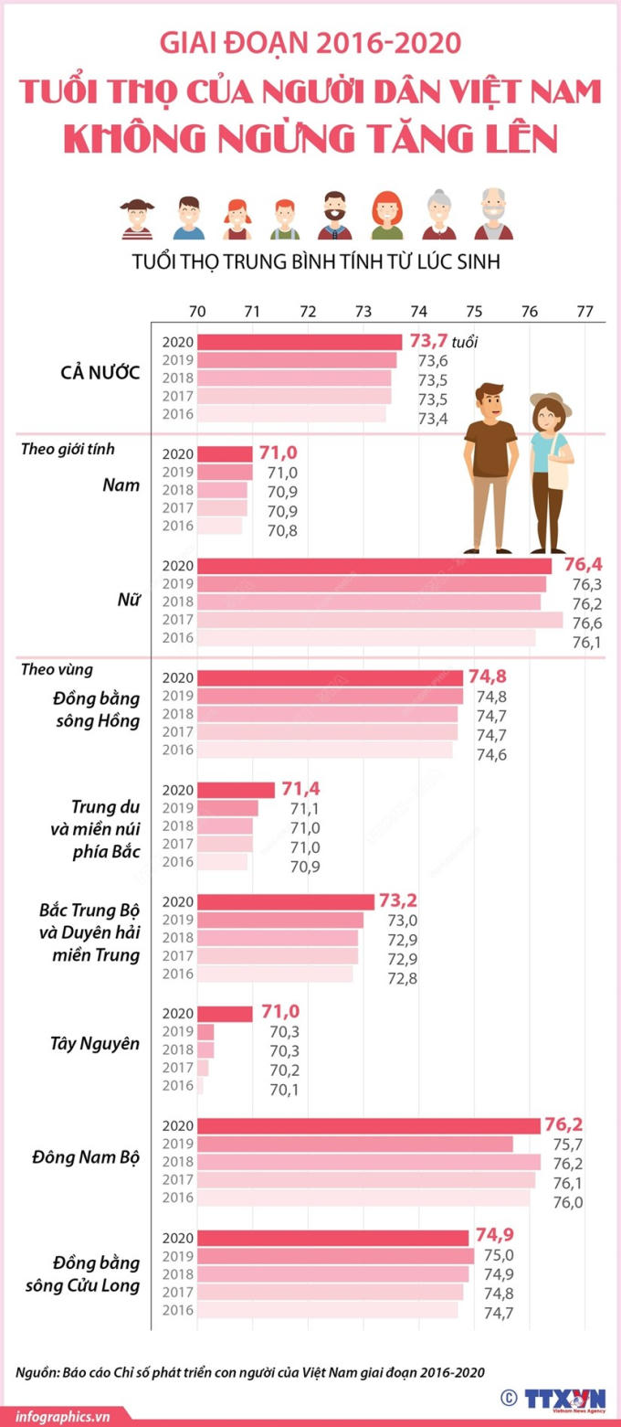 Giai đoạn 2016-2020, mỗi năm tuổi thọ trung bình tính từ lúc sinh của người dân Việt Nam tăng 0,1 năm, từ 73,4 năm 2016 tăng lên 73,7 năm 2020.