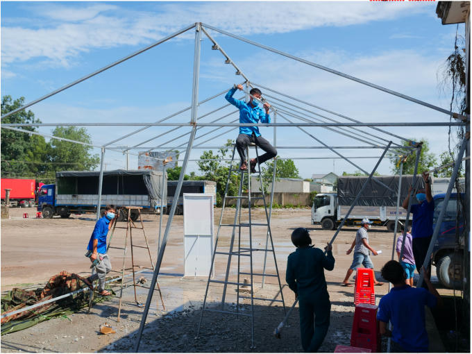 Tại chốt kiểm soát liên ngành ở xã Tân Lập (H.Đồng Phú), ĐVTN huyện Đồng Phú đang dựng lại các lán trại bị gió quật sập để người dân vào khai báo y tế.