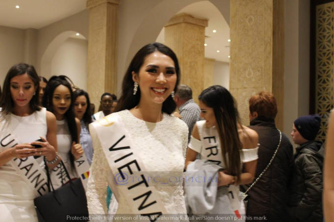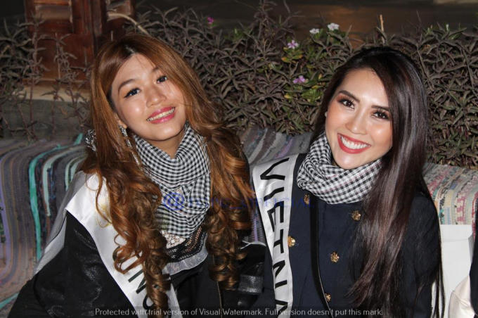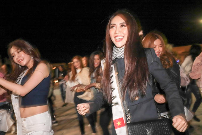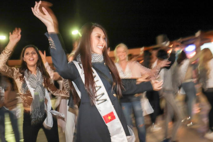 Tường Linh rất hào hứng hòa vào đám đông các thí sinh, cùng nhảy múa vui vẻ trên nền nhạc truyền thống xứ Ả Rập. Sau nhiều ngày tham gia các hoạt động liên tục, hôm nay các người đẹp mới có một buổi thư giãn thoải mái, vì vậy các cô đã rất hào hứng tham gia.
