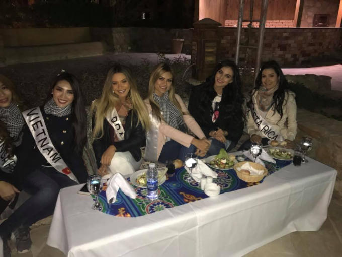 Trong ngày hôm nay, Tường Linh và thí sinh các nước đã có chuyến đi trải nghiệm khám phá sa mạc Ai Cập. Dù là quốc gia nằm ở khu vực nhiệt đới với sa mạc bao phủ phần lớn diện tích nhưng thời điểm này về đêm nhiệt độ tại đây xuống khá thấp, Tường Linh đã diện trang phục “kín cổng cao tường” cùng người đẹp các nước đến dự bữa tiệc tối ngoài trời giữa sa mạc.