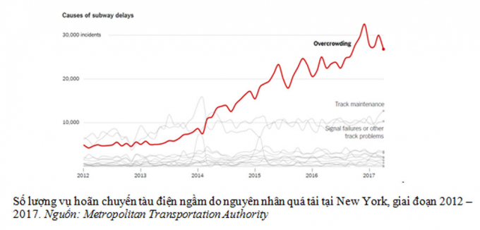 Số lượng vụ hoãn chuyến tàu điện ngầm do nguyên nhân quá tải tại New York, giai đoạn 2012 – 2017. Nguồn: Metropolitan Transportation Authority