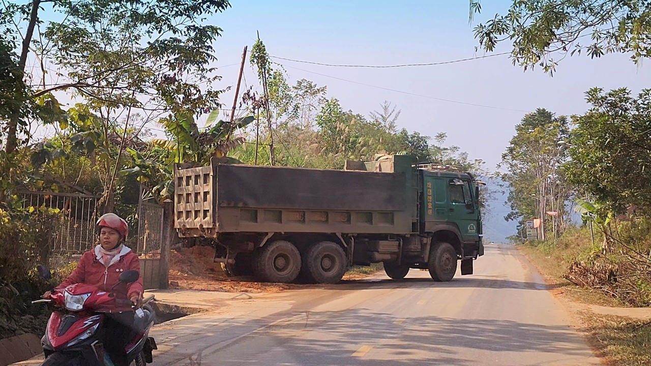 Sau khi đổ đất trong một khu bãi thải rộng hàng ngàn m2, những chiếc xe xồng xộc cắt ngang đường Quốc lộ 2C đoạn thôn Đài Thị, xã Yên Lập.