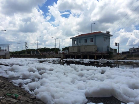 Trưa 27/8, dọc tuyến kênh Lò Gốm đoạn qua phường 16, quận 8, TPHCM xuất hiện bọt trắng như tuyết nổi dày đặc, mỗi khi gió thổi qua lớp bọt này bay khắp nơi bám vào người đi đường.