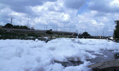 Lớp bọt trắng như tuyết nổi lên thành từng mảng lớn trôi theo dòng nước, mỗi khi có gió thổi qua, từng mảng bọt bị thổi bay khắp nơi. Nhiều người đi đường bị bọt bay trúng, các nhà dân bên đường cũng bị bọt bay vào. Theo người dân, lớp bọt dính vào người bốc mùi rất hôi và bẩn nên ai cũng né tránh.