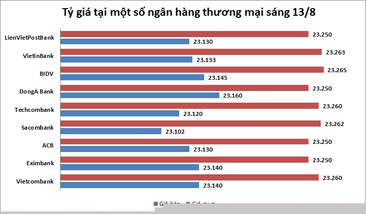Theo khảo sát của thoibaonganhang.vn, sáng nay (13/8), phần lớn các ngân hàng giữ nguyên biểu giá USD. Hiện giá bán USD tại các ngân hàng phổ biến trong khoảng 22.250-22.260 đồng/USD.