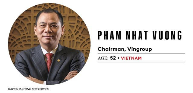 Tỷ phú Phạm Nhật Vượng, ông chủ của tập đoàn Vingroup cũng góp mặt trong danh sách này, cùng với ông Tadashi Yanai - Chủ tịch Fast Retailing (Nhật Bản) và ông Li Shufu - chủ Geely Automoblie Holdings (Trung Quốc).