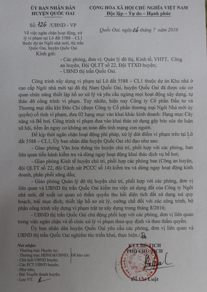 Ngay sau khi Pháp luật Plus đăng tải bài viết “Bể bơi và cây xăng không phép ngang nhiên mọc dưới chân cột điện cao thế?”, phản ánh về việc Công ty cổ phần Đầu tư và Thương mại dầu khí Đức Chi ngang nhiên xây dựng bể bơi và cây xăng không phép ngay dưới chân cột điện cao thế 110Kv (tại khu vực Tổ dân phố Ngô Sài, thị trấn Quốc Oai, huyện Quốc Oai – nằm trong khuôn viên Lô đất 5588-CL1 thuộc dự án Khu nhà ở cao cấp Ngôi nhà mới tại Khu đô thị Nam Quốc Oai), UBND huyện Quốc Oai đã có văn bản chỉ đạo dừng ngay hoạt động đối với 2 công trình sai phạm nói trên và yêu cầu công ty tự tháo dỡ.