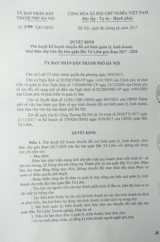 Sau đó, ngày 2/12/2017, UBND TP Hà Nội quyết định phê duyệt kế hoạch chuyển đổi mô hình quản lý, kinh doanh khai thác chợ trên địa bàn quận Bắc Từ Liêm giai đoạn 2017-2020.