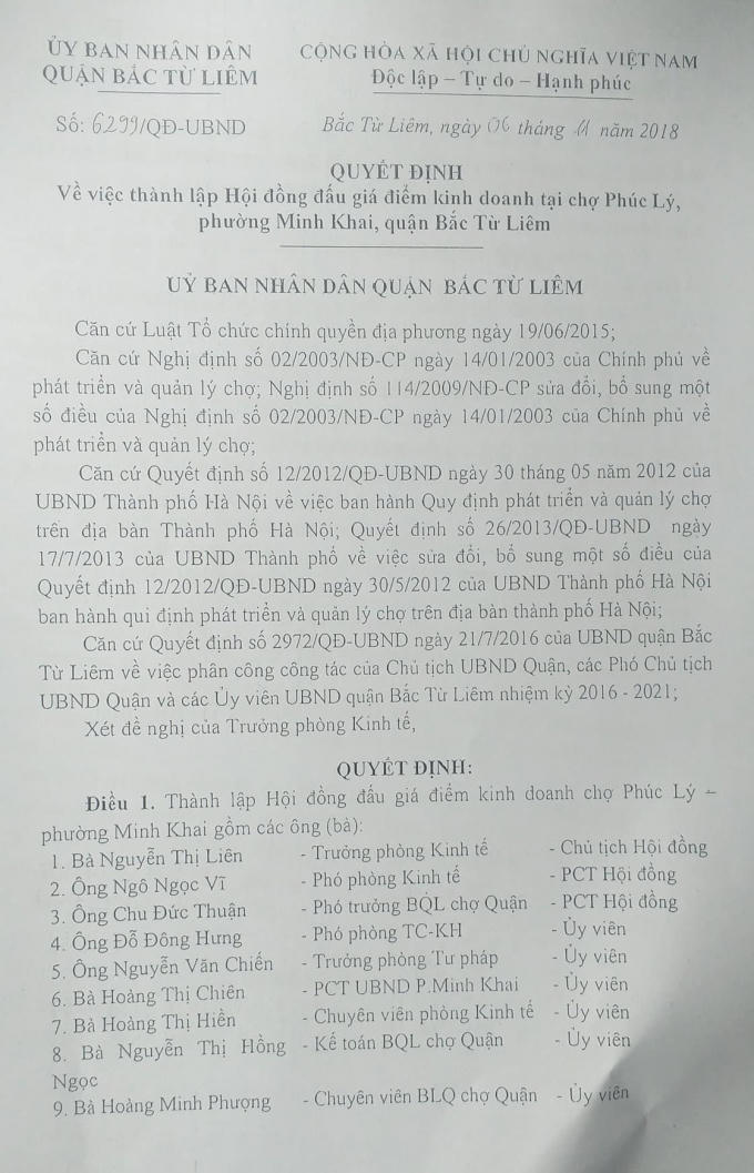 Tiếp đến, ngày 6/11/2018, UBND quận Bắc Từ Liêm ban hành quyết định về việc thành lập Hội đồng đấu giá điểm kinh doanh tại chợ Phúc Lý.
