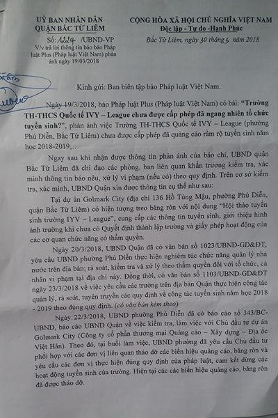 UBND quận Bắc Từ Liêm vừa có văn bản gửi tòa soạn Pháp luật Plus (báo Pháp luật Việt Nam) xung quanh vụ việc Trường IVY- League tổ chức tuyển sinh.