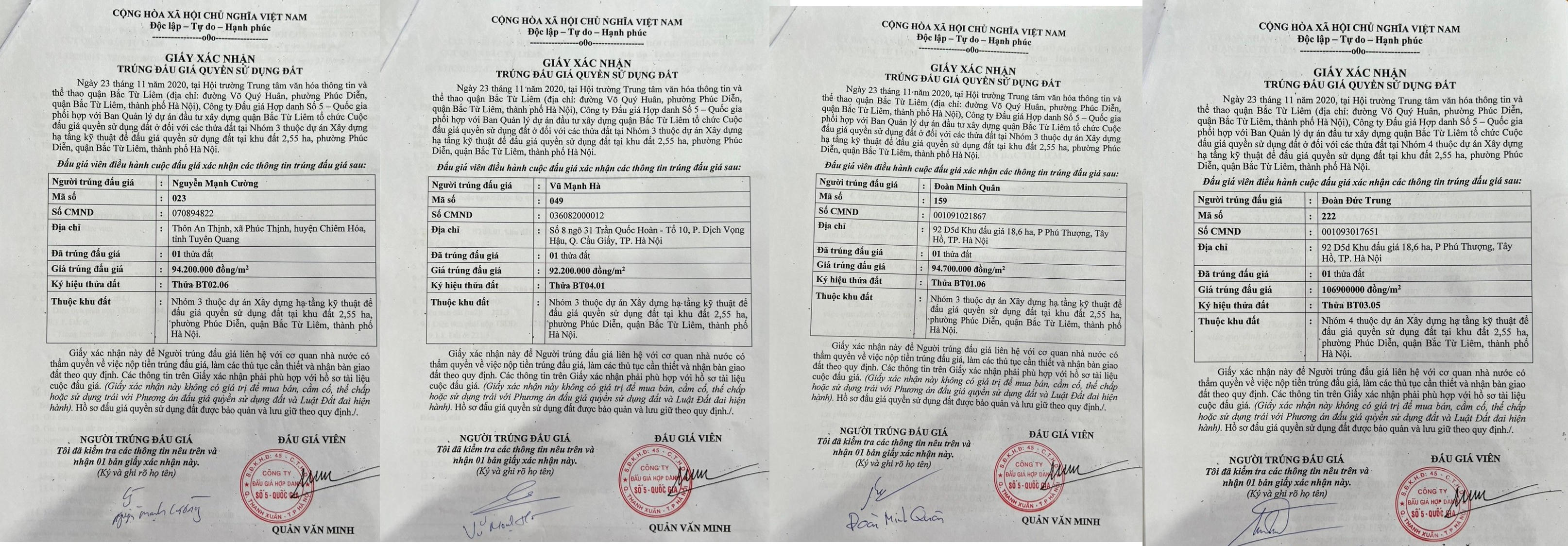 Ngay khi nhiều nhà đầu tư trúng đấu giá (trước đó mỗi người phải đặt cọc 500 đến 900 triệu đồng), ngày 26/11/2020 UBND quận Bắc Từ Liêm đã ban hành hàng loạt quyết định công nhận kết quả trúng đấu giá quyền sử dụng đất đối với các thửa đất thuộc dự án kể trên với giá từ 90 đến 95 triệu đồng/m.