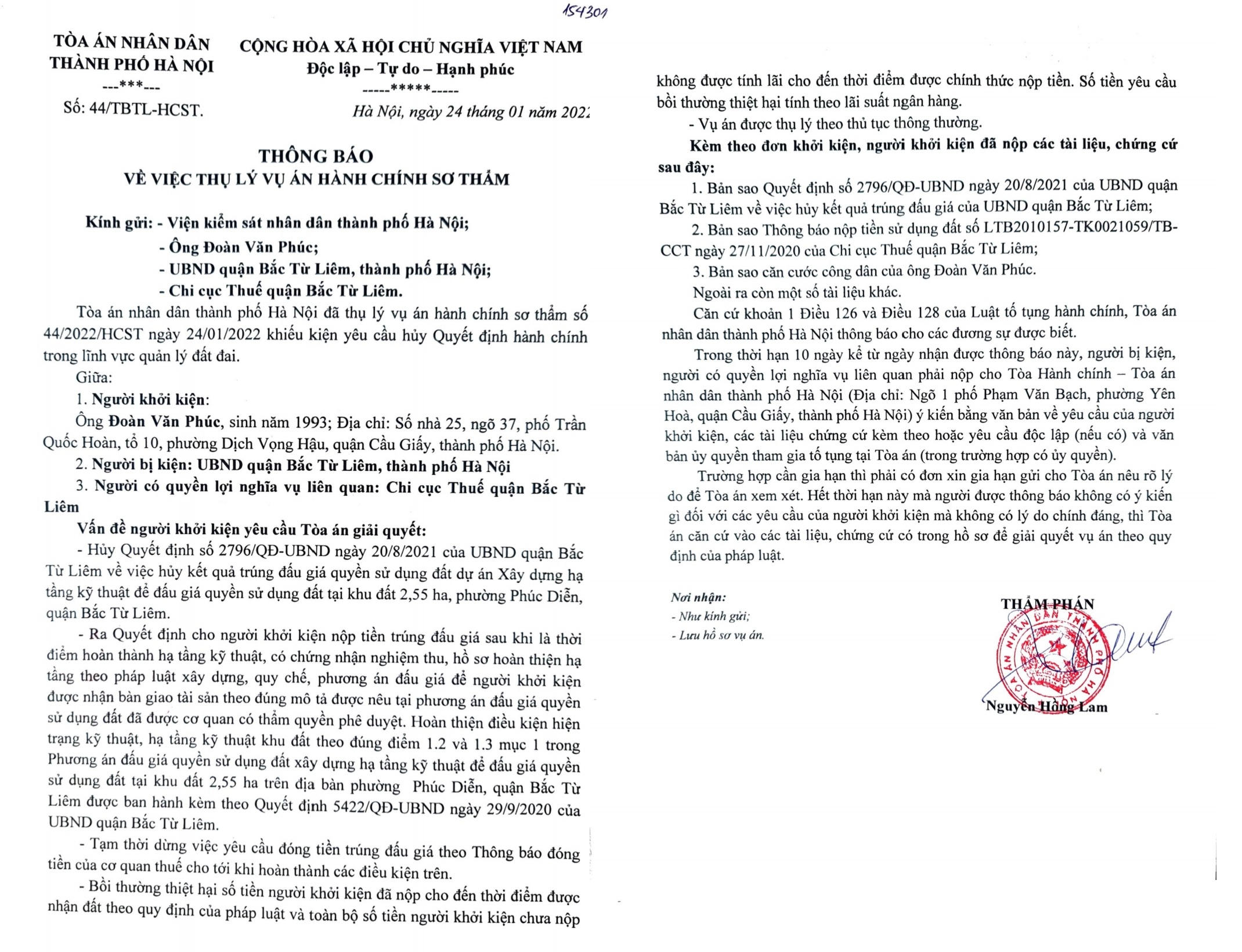 Đến ngày 24/01/2022 Tòa án nhân dân thành phố Hà Nội đã ra Thông báo về việc thụ lý vụ án hành chính sơ thẩm số: 41/TBTL-HCST khiếu kiện yêu cầu hủy quyết định hành chính.