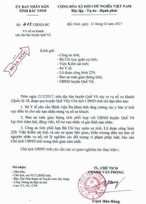Văn bản hỏa tốc số 413/UBND-NC nêu rõ, đêm 21/2, trên địa bàn huyện Quế Võ xảy ra vụ nổ xe khách (Quốc lộ 18, đoạn qua huyện Quế Võ); Chủ tịch UBND tỉnh chỉ đạo như sau: