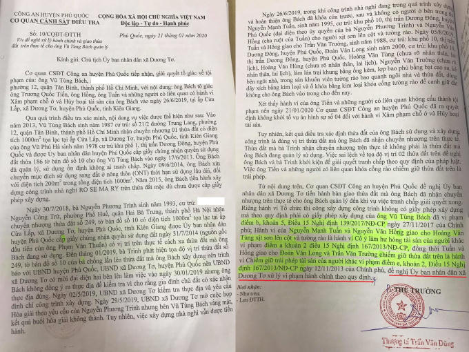 Căn cứ các nội dung nêu trên, ngày 21/01/2020, Cơ quan cảnh sát điều tra Công an huyện Phú Quốc đã có Công văn số 10/CQĐT-ĐTTH gửi Chủ tịch UBND xã Dương Tơ về việc đề nghị xử lý những đối tượng vi phạm và giao thửa đất trên thực tế cho ông Vũ Tùng Bách quản lý.