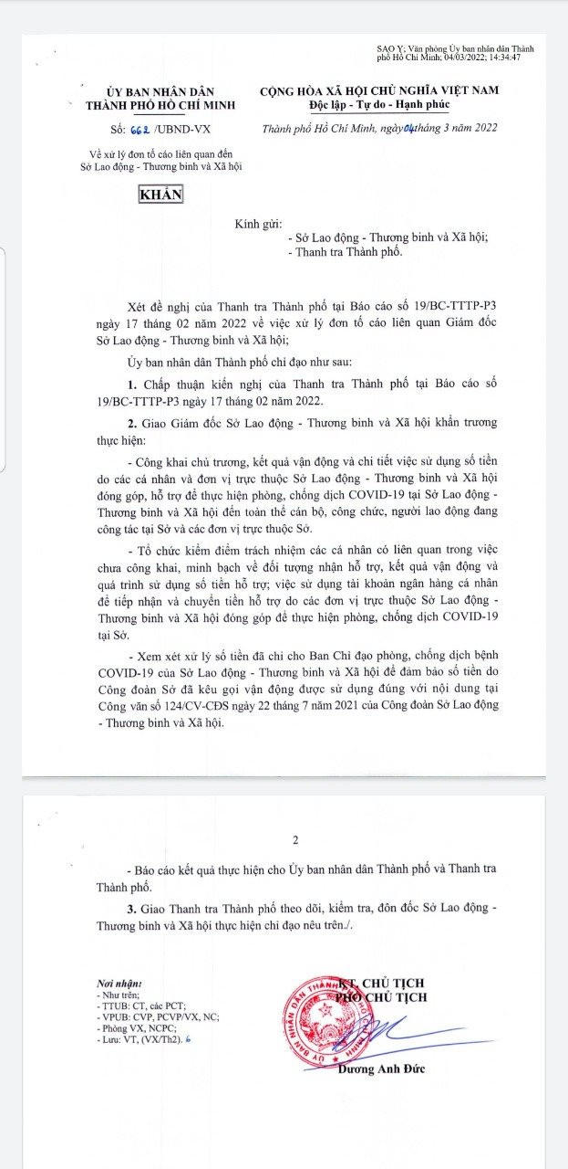 Bên cạnh đó, xem xét, xử lý số tiền đã chi cho Ban Chỉ đạo phòng, chống dịch bệnh Covid-19 Sở LĐ,TB-XH để đảm bảo số tiền do Công đoàn sở đã kêu gọi vận động được sử dụng đúng mục đích. Thanh tra TP HCM được giao nhiệm vụ theo dõi, kiểm tra, đôn đốc Sở LĐ,TB-XH thực hiện chỉ đạo trên.