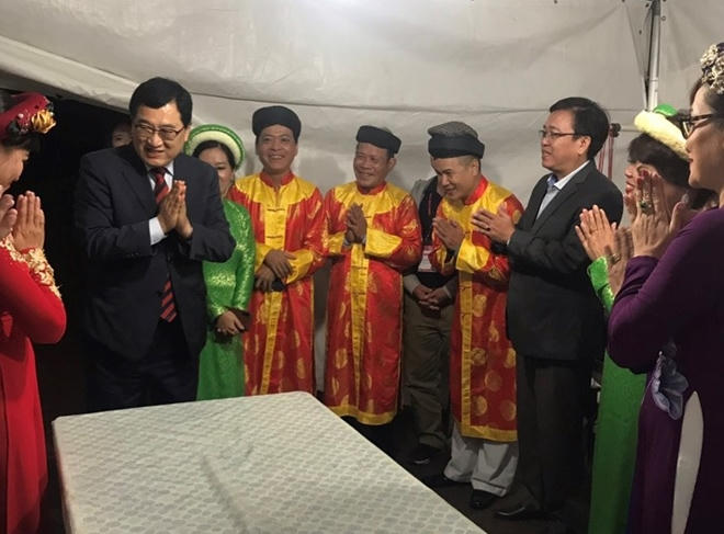 Thị trưởng thành phố Gyeongju chúc mừng các nghệ sĩ trong đoàn nghệ thuật TP Huế sau chương trình biểu diễn tại lễ hội văn hóa Silla.