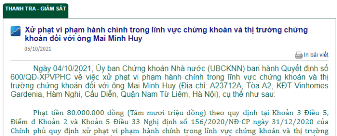 Ngày 04/10/2021, Ủy ban Chứng khoán Nhà nước (UBCKNN) ban hành Quyết định số 600/QĐ-XPVPHC về việc xử phạt vi phạm hành chính số tiền 80.000.000 đồng (Tám mươi triệu đồng), vì đã có hành vi vi phạm hành chính không công bố thông tin về việc dự kiến giao dịch trong lĩnh vực chứng khoán và thị trường chứng khoán đối với ông Mai Minh Huy (Địa chỉ: A23712A, Tòa A2, KĐT Vinhomes Gardenia, Hàm Nghi, Cầu Diễn, Quận Nam Từ Liêm, Hà Nội).