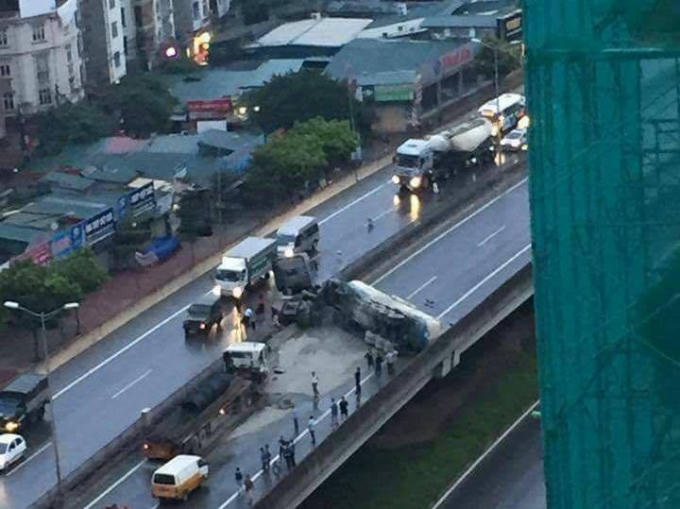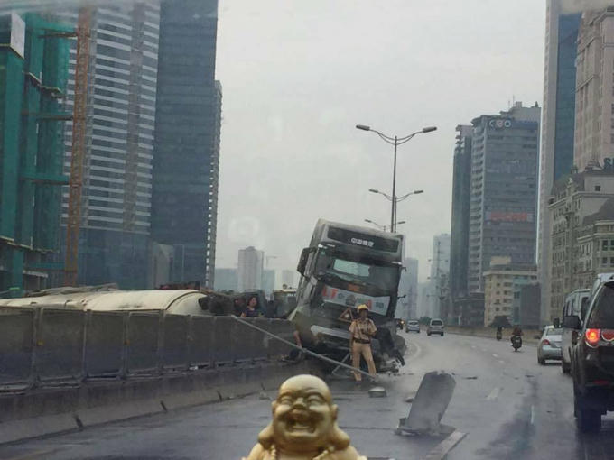 Liên quan đến sự việc trên, sáng 14/9, trung tá Nguyễn Trung Thành, Đội trưởng Đội CSGT số 6 (Phòng CSGT TP Hà Nội) xác nhận thông tin và cho biết, “Chiếc xe bồn đang lưu thông theo hướng từ Big C đi cầu Thăng Long, khi đến gần ngã tư Phạm Hùng - Dương Đình Nghệ đã thiếu chú ý quan sát và đâm vào đuôi xe tải đang đỗ trái chiều trên đường cao tốc. Hậu quả, chiếc xe bồn bị lật ngang đường, rất may lái xe không bị thương”.