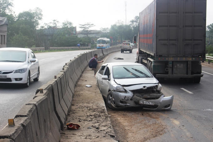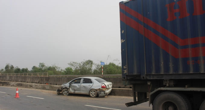 Ghi nhận của PV Báo Giao thông tại hiện trường, xe ô tô đầu kéo chỉ xước nhẹ phần đầu bên trái, còn xe ô tô 4 chỗ xoay chiều ngược lại theo hướng Huế-Quảng Trị và “dính” vào đoạn bê tông chân dải phân cách QL1 trong tình trạng hư hỏng nặng cả phần đầu và đuôi xe.