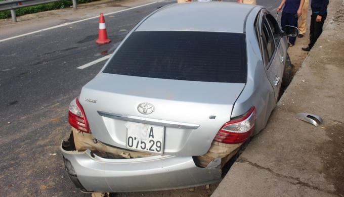 Lốp trước bên trái ô tô 4 chỗ xẹp lép, hông xe bên trái sát vị trí tài xế ngồi bị móp méo, gương chiếu hậu phía tài xế cũng văng khỏi xe... Tuy nhiên, cả tài xế và 2 người ngồi trên ô tô 4 chỗ đều may mắn thoát nạn.