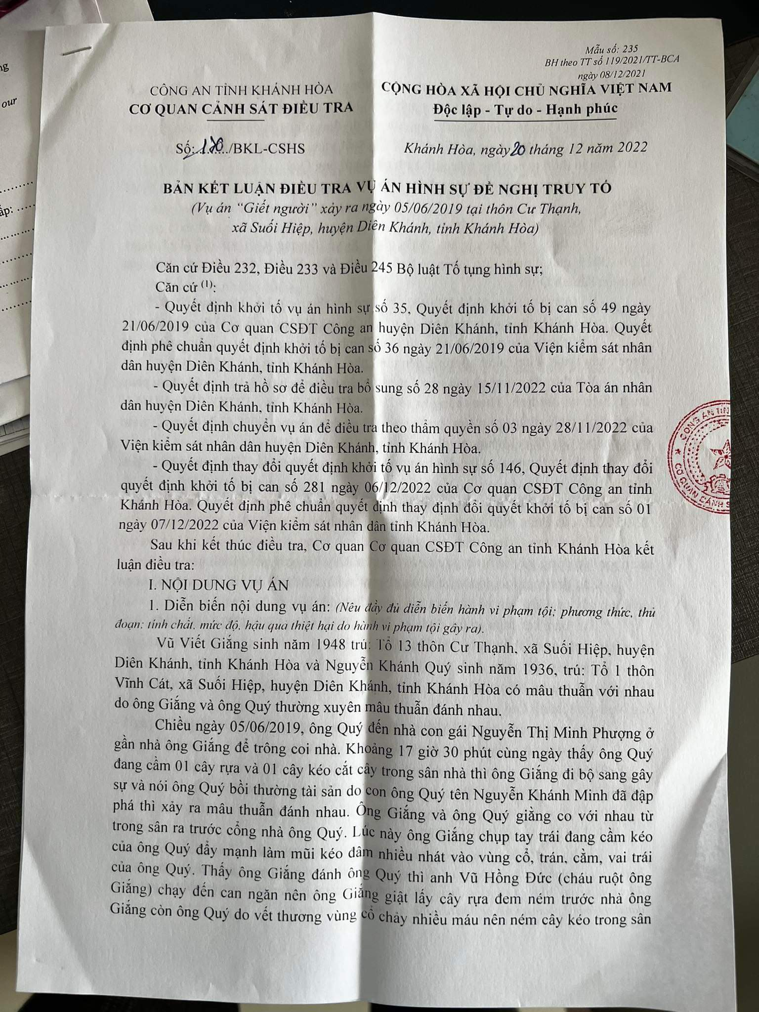 Bản Kết luận điều tra của Cơ quan CSĐT tỉnh Khánh Hoà.