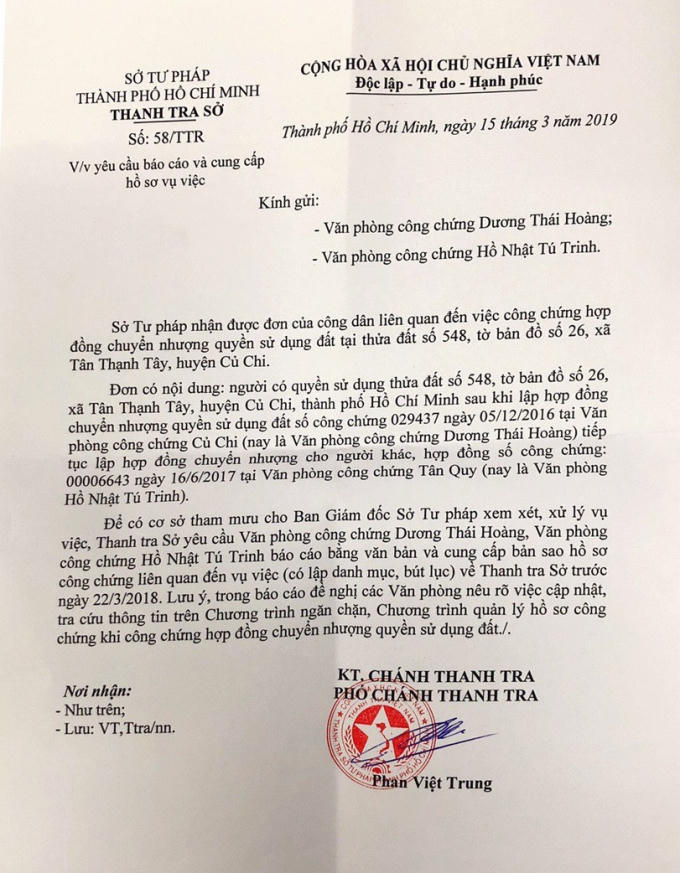 Mới đây, ngày 8/4, Sở Tư pháp TP HCM đã có văn bản trả lời đơn của bà Trần Thị Thảo, qua đó đề nghị bà Thảo liên hệ với VPCC để giải quyết các vấn đề liên quan theo đúng quy định.