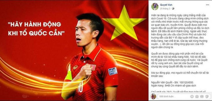 Mới đây, Văn Quyết đã bán áo thi đấu, kêu gọi quyên góp trên 100 triệu đồng để mua những thiết bị y tế cần thiết phục vụ cho công tác chống dịch của các y, bác sĩ nơi tuyến đầu chống dịch Covid-19.